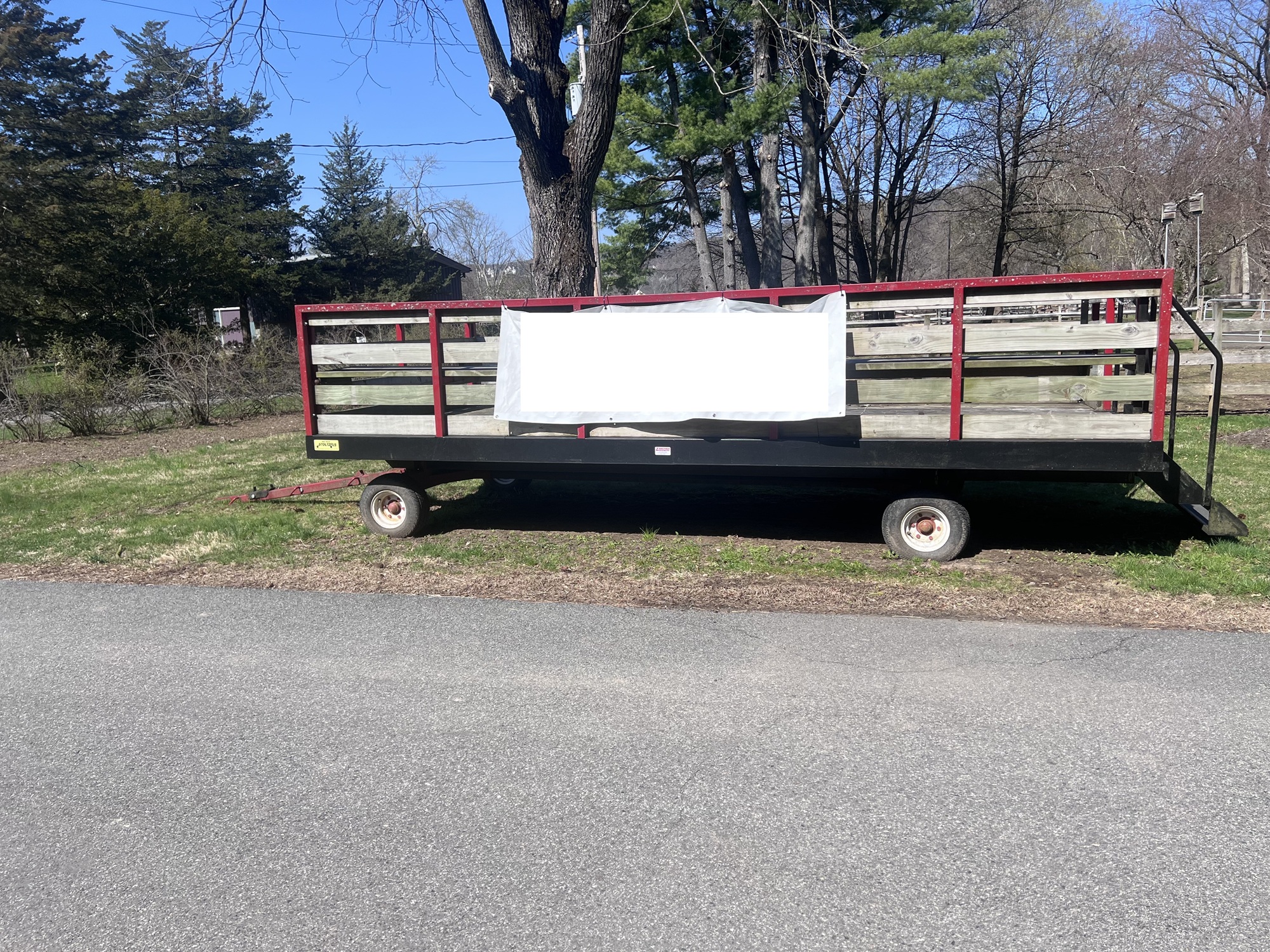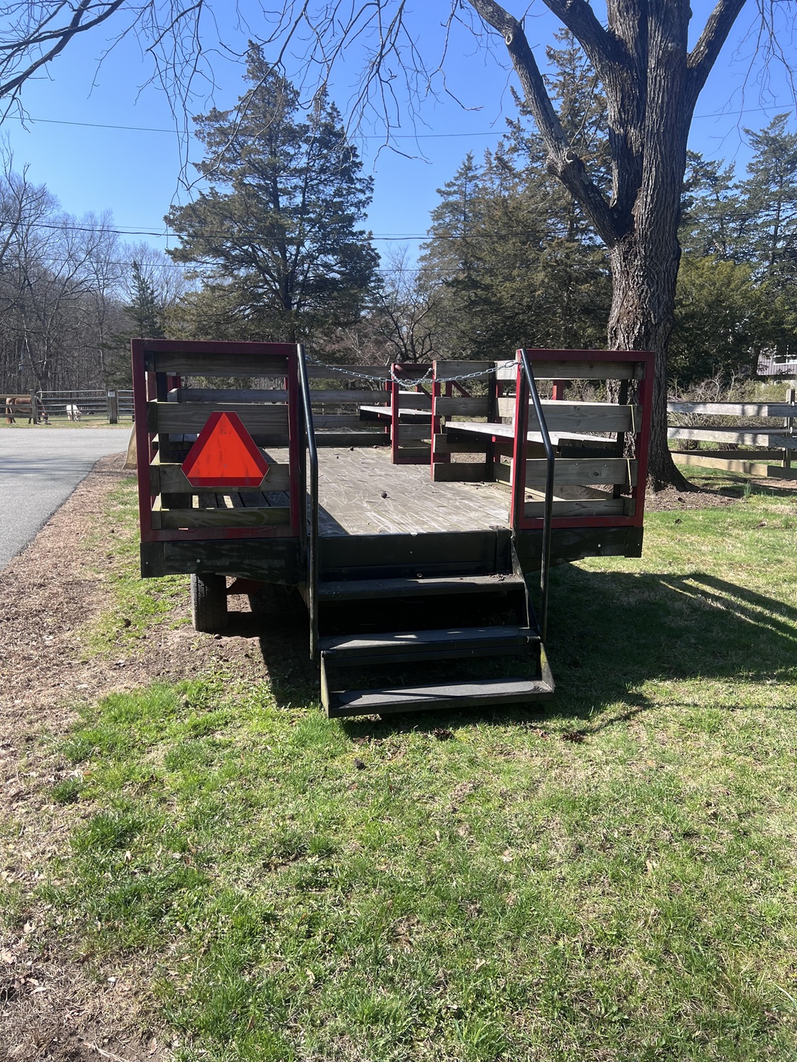 Stoltzfus 8.5x18' hayride wagon, with a side opening and rear steps.