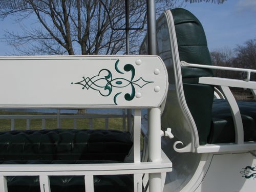 This carriage is the only authentic reproduction of its kind ... based off of Studebaker print and details. The articulate pinstriping and artwork was done by Ernis Schwartz. Has working hydraulic brakes, lamps and taillights. Has windowed side curtains for inclement weather. With included crank and hardware, the top (on stainless steel posts) can be raised and lowered by one person if/when trailering. Comes with shafts and pole. This solid quality-built vehicle is in excellent condition, however one of the side curtains has a cracked clear poly section.