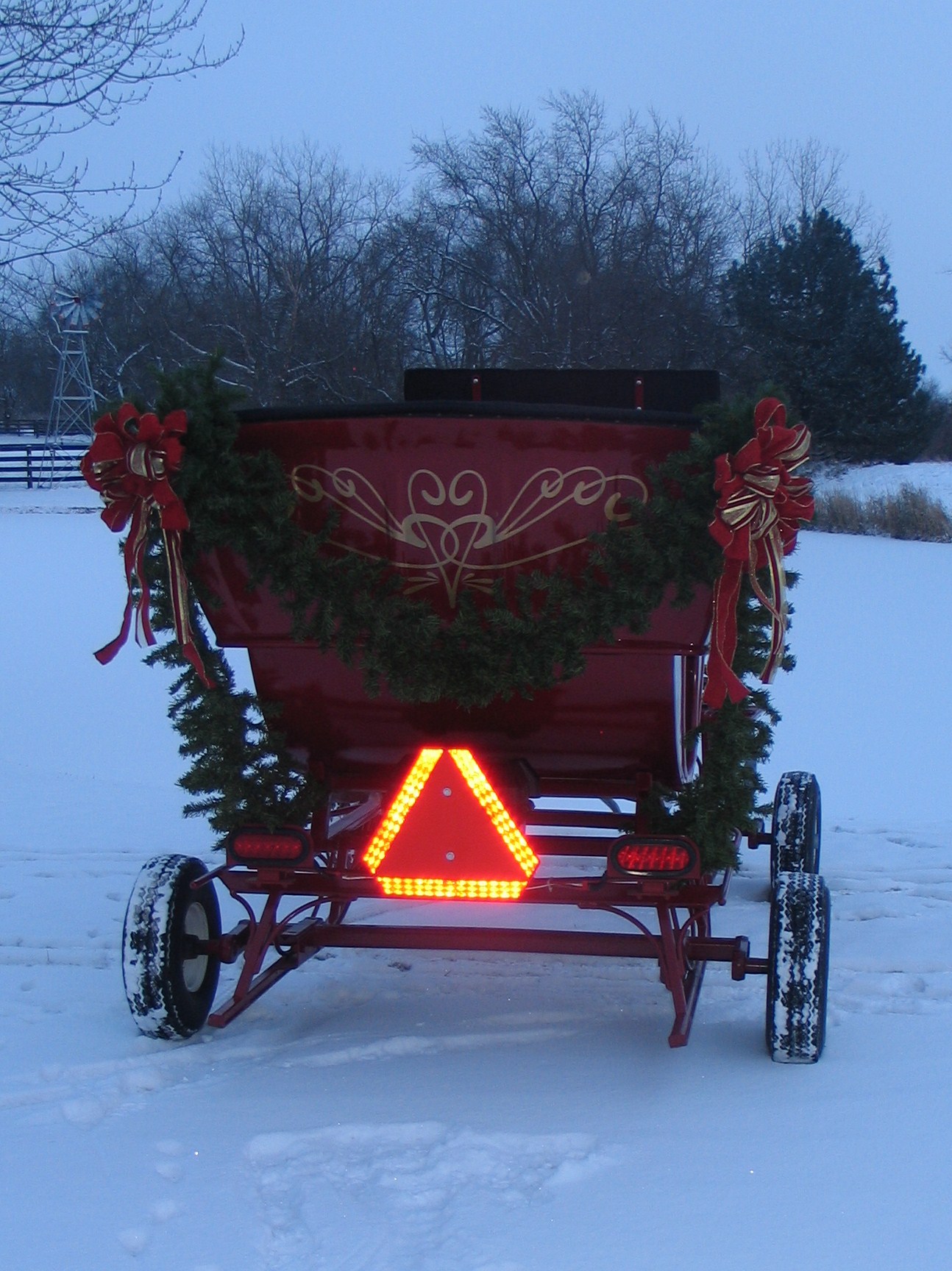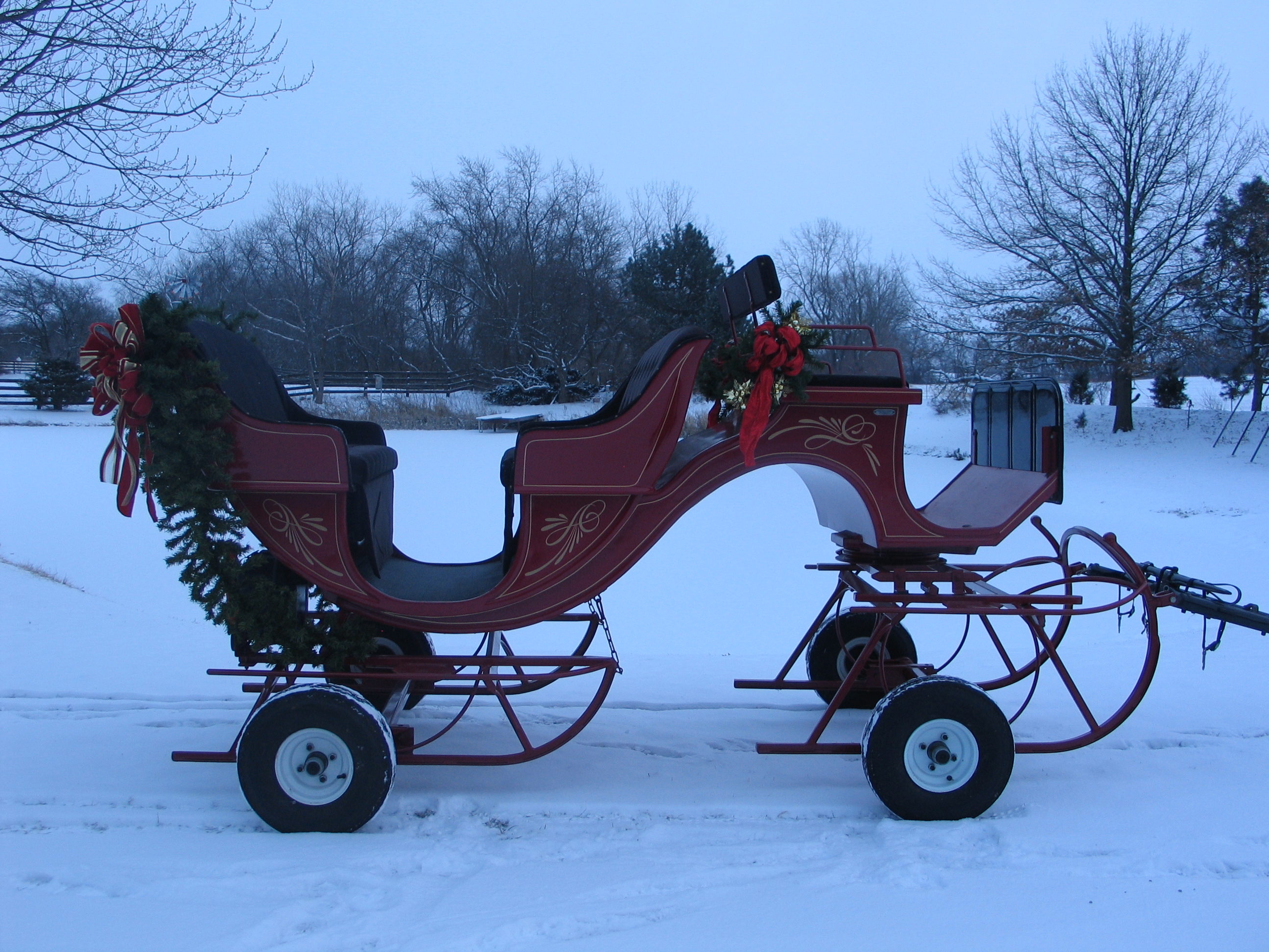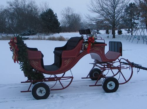 Catchy 6-passenger Vis-A-Vis Style Bob-Sleigh. Called such because the front runners turn by means of a roller bearing fifth wheel, which makes this vehicle highly maneuverable. When using it for rides without snow it has 2 torsion axles which are bolted to the runners by means of 2 bolts. Torsion axles are used instead of straight axles in order to give passengers a smooth ride on pavement. This unique piece is a money-making crowd pleaser. Plus generate extra income with or without a horse just as a photo prop. It is 11' long, 5'6" wide and on wheels 5'8" tall at the driver's seat backrest. Comes with horse shafts.